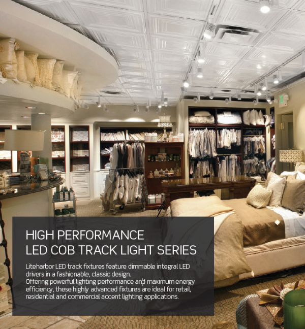 Liteharbor LED track fixtures feature dimmable integral LEDdrivers in a fashionable, classic design. Offering powerful lighting performance and maximum energy efficiency, these highly advanced fixtures are ideal for retail, residential and commercial accent lighting applications.