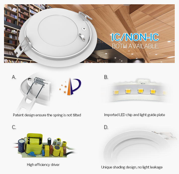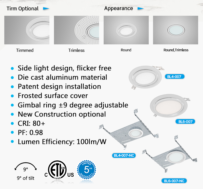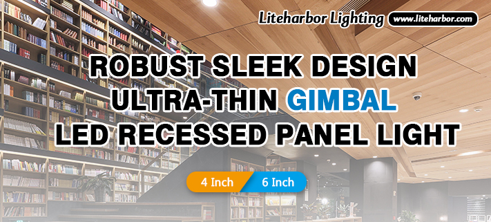 Liteharbor Ultra-thin LED Gimbal Recessed Panel Light Series for Insulated Ceiling, including the junction box and driver. Gimbal LED Series is designed for 9° tilt. The thin profile with spring clips allows for quick and easy installation. Ideal for confined spaces. The small size led panel light in size 4” and 6”, in round shape.