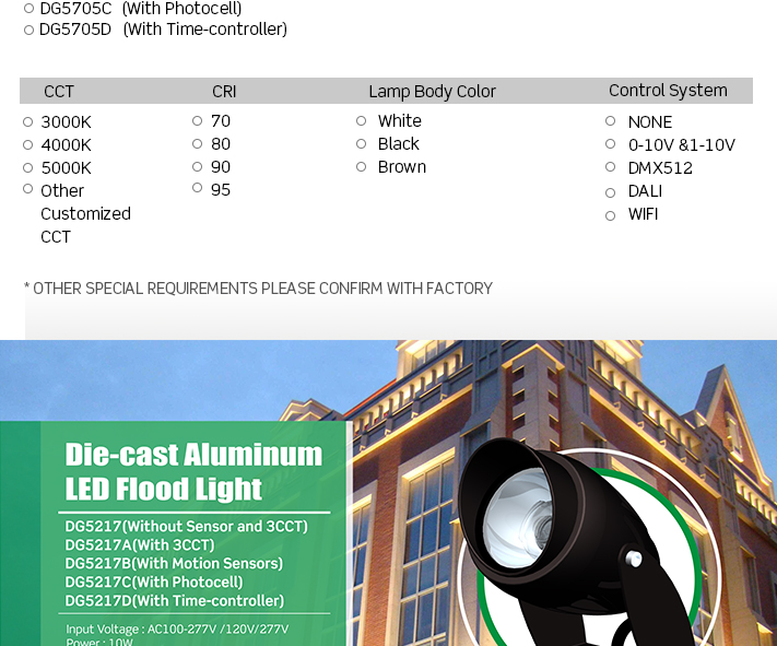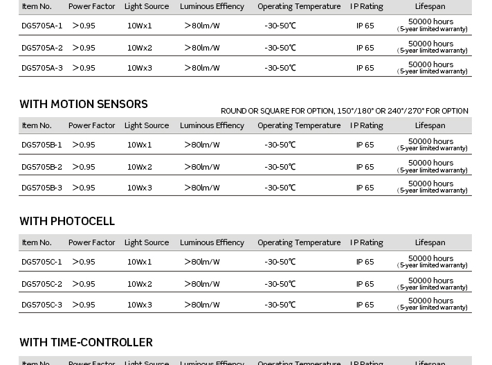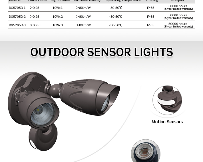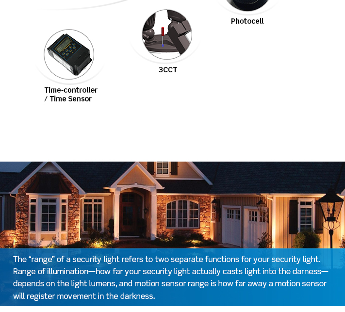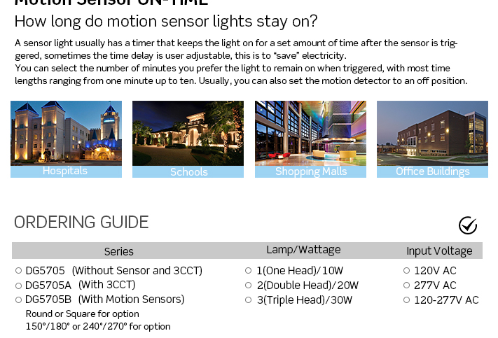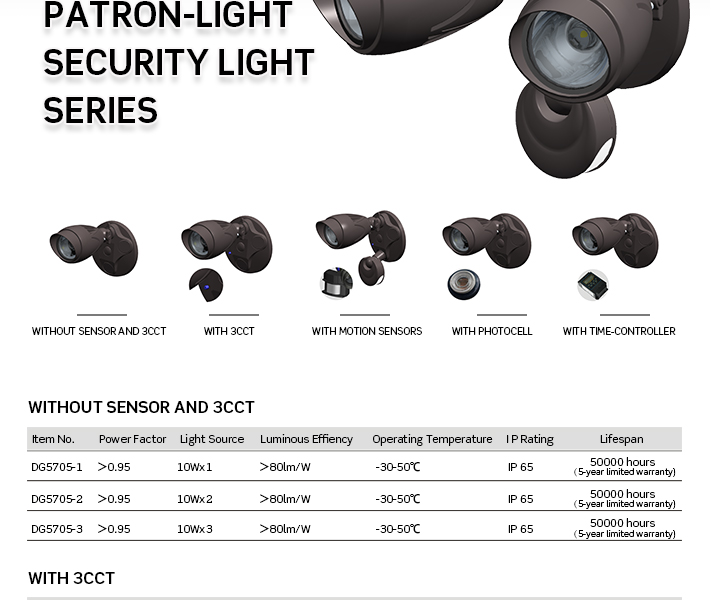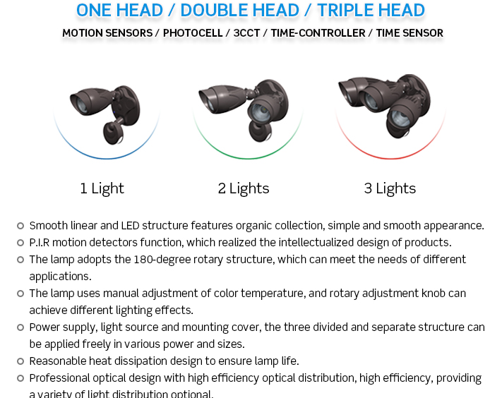 Liteharbor Patron-light Series including 1-3 Head LED Security Lights, 1 Head LED Flood Light and 1-3 Head LED Landscape Lights, have many functions such as 3CCT, Motion Sensor, Photocell, Time Sensor and etc. All the products are made of the die-cast aluminum material with IP65 waterproof Rating, Best for a variety of indoor and outdoor applications.