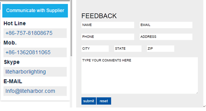 Liteharbor have a variety of contact methods, not only open the on line service, but also retain our contact information and feedback section www.liteharborfactory.com/contactus/. You can call us, skype us, email us and feedback direct.