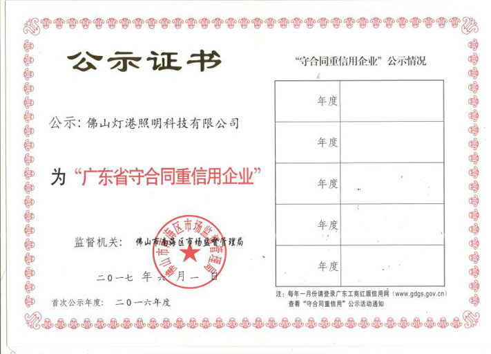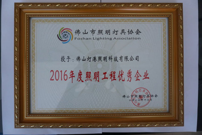 Now Foshan Lighting Association awarded us the "Lighting Industry Outstanding Enterprises" and "Lighting Engineering Outstanding Enterprises" these two titles. At the same time, we obtained the title “Honoring Contract, Keep Promise Enterprise In Guangdong Province”from Foshan Nanhai District market supervision and Administration Bureau.