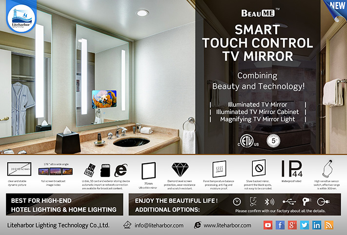 Liteharbor Lighting smart touch control TV mirror, elegant contemporary slimline mirror design, more than 12 years OEM/ODM experienceIt, easy to install with wall mounted design, quality warranty for 5 years, IP44 Rated for safe use, various sizes and designs available upon your request, is ideally suited for bedrooms and living rooms, where it delivers a tint-free viewing experience and exceptional visual clarity.