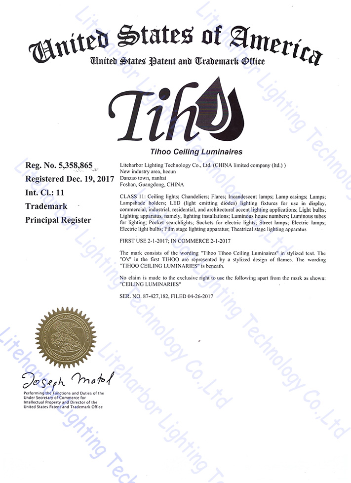 Liteharbor Tihoo Ceiling Luminaires Trademark Certificate has been issued and the Brand names and trademarks of our company are registered and patented.