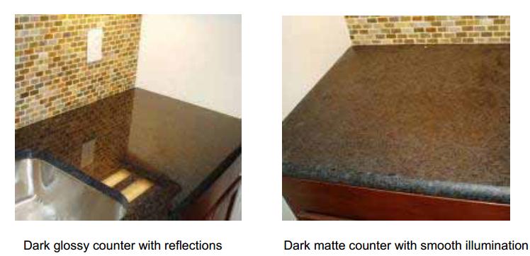Countertops with a matte finish will produce a smoother lighting effect than those that are glossy, greatly reducing reflections. Light-colored surfaces will have a higher reflectance, resulting in a brighter appearance, than dark-colored surfaces.