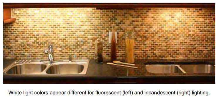Since people are working at the counter, colors and textures of foods and surfaces need to be well enhanced. The appropriate correlated color temperature (CCT), or color appearance, depends on the décor and personal preference. For wood tones, warm-colored tiles, copper-toned metal backsplashes or warmtoned walls, warm CCTs in the 2700 to 3500 kelvin (K) range are appropriate. For decorative glass tiles, glass shelves, cool-toned tiles or gray-toned metal colors, cool CCTs in the 3500 to 5000 K range are appropriate. Some manufacturers also label their product packaging with the CCT. If the products are not labeled, look for in-store displays where you can see the color of the lighting first-hand.