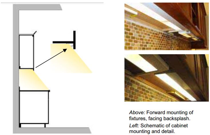 Under-cabinet lighting should not be glaring to anyone, especially someone in a seated position elsewhere in the room. Fixtures mounted under the cabinets should be well shielded; if the cabinet does not provide enough of a recess to conceal the fixture, a piece of trim molding approximately 1 in. wide should be added to the bottom of the cabinet. Installation toward the front of the cabinet or shelf with the light source facing the back is generally recommended. This produces the most even light distribution on both the countertop and the backsplash. This location is also useful in reducing the potential for direct view of the light source, typically resulting in the least glare.