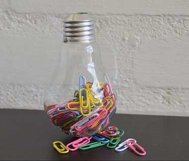 Light bulbs make great paper clip dispensers.The weight of the paperclips will hold the light bulb.When the paper clip is needed, just shake the light bulb