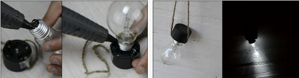 Glue a string to the light and the bulb on top of the LED. Now hang the bulb outside. It will charge during the day and light up during the night. It will look like the actual light bulb is glowing