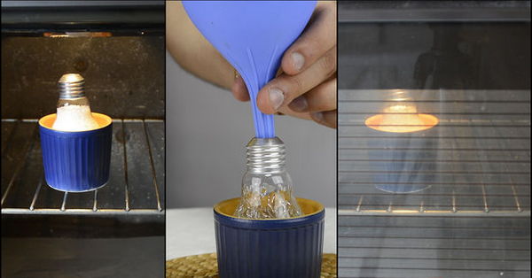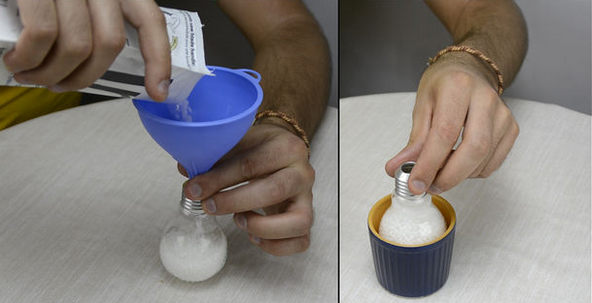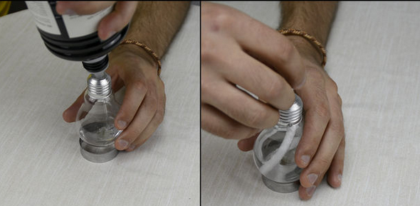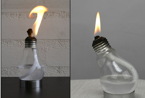 Metal cookie cutter is a great choice to hold the bulb.Fill the bulb with the fuel (I used paraffin based fuel) Insert the wick and let it absorb the fuel before lighting it up.