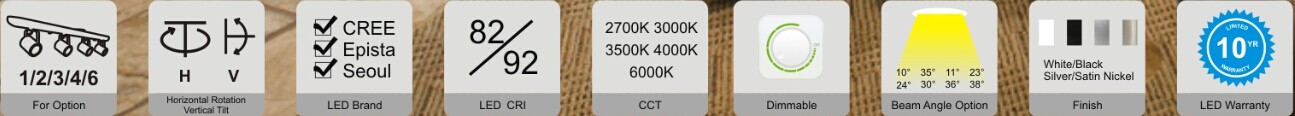 Provide 360° rotation and 90° vertical aiming, They are dimmable using high-quality, reverse-phase dimmers and are available in black, silver, satin nickel or white finishes.