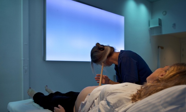 Pictured: The maternity ward in Hillerod Hospital in Denmark uses a programme of light and sound to help mothers feel more relaxed.