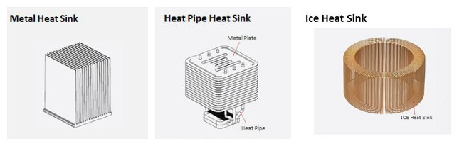 There are three main types of heat sink: metal heat sink, heat pipe heat sink, ICE heat sink.