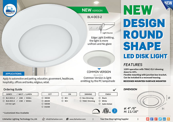 This Disk Light is a universal surface mount trim/luminaire, edge light emitting, the light is more uniform and no glare. 4 inch or 6 inch is optional.