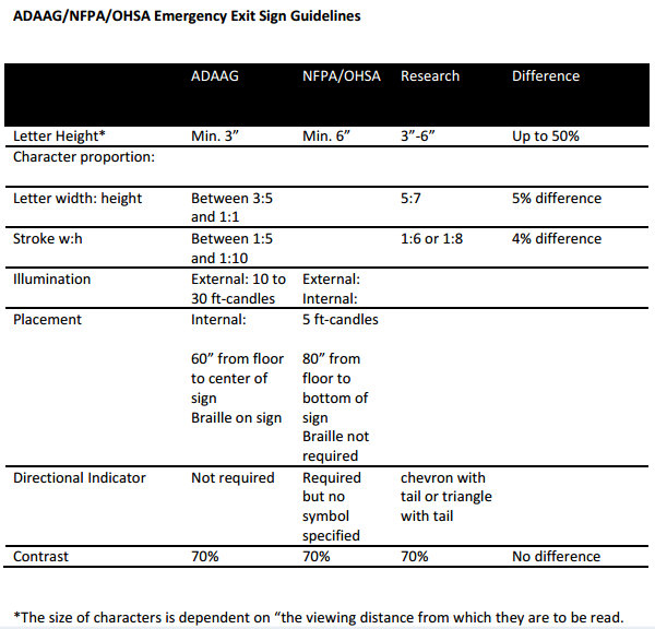 The National Fire Protection Association Life Safety Code requires that emergency fire exit signs must have a reliable lighting source with a backup power source that can provide continuous power for at least 1.5 hours. Exit and directional signs shall have a luminance on the face of such signs of not less than 50 lux.